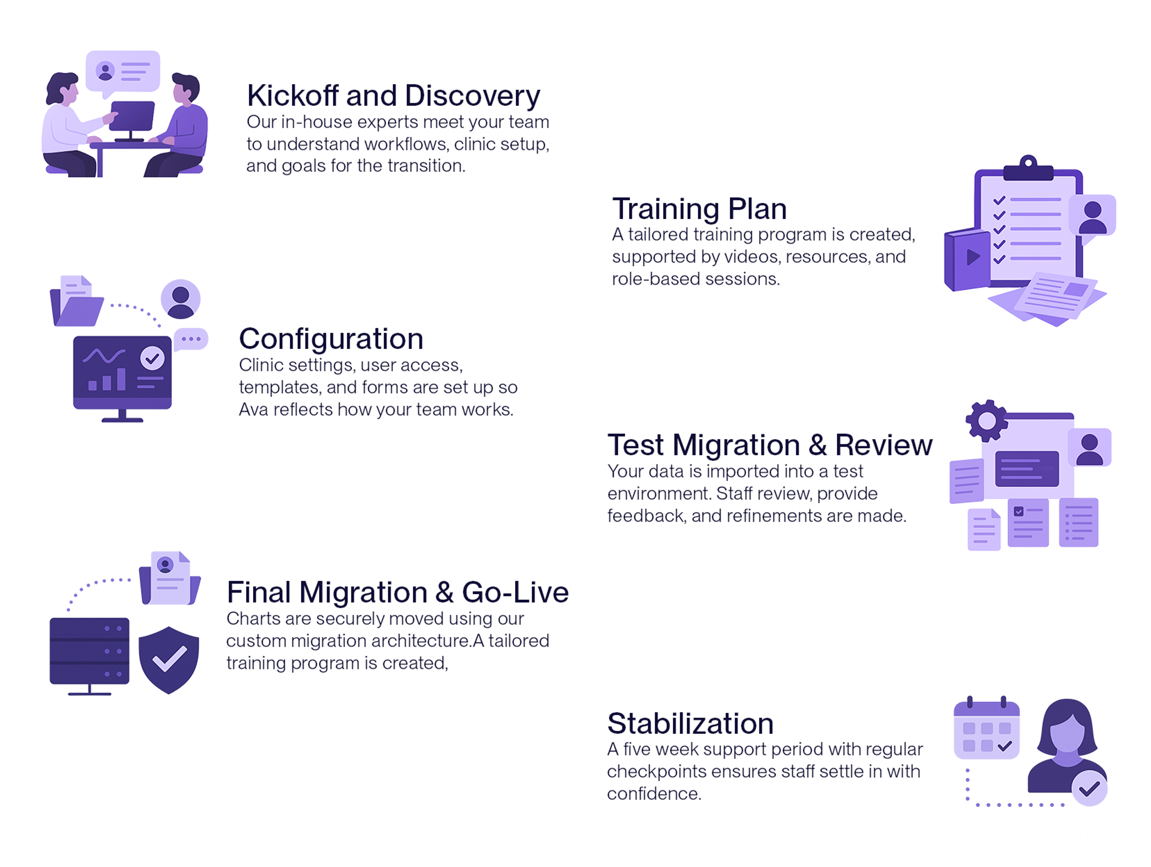 Our processEvery migration is managed by Ava’s in-house Project Management team. We plan around your clinic’s schedule, guide your staff through the transition, and stay close until you are fully comfortable in your new system.